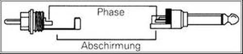 Y-Kabel 6,35mm Stereoklinke auf 2 x Cinch Abschirmung aller Stecker an Gehäuse, Phase1 von Spitze Chinch1 an Ring Stereoklinke, Phase2 von Spitze Cinch2 an Spitze Stereoklinke
