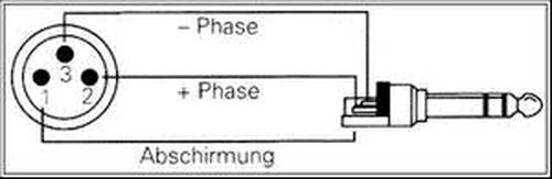 Standard 6,35mm Stereo Klinkenstecker auf XLR (Symetrisch) Abschirmung von Gehäuse Klinke an Pin1 XLR Phase+ von Spitze Klinke zu Pin2 XLR,Phase- von Ring Klinkke zu Pin3 XLR