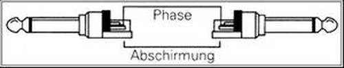 6,35mm Y-Kabel 2x 6,35mm Monoklinke auf 1x 6,35mm Stereoklinke Abschirmung an Gehäuse aller Stecker, Phase1 von Spitze Monoklinke an Ring Stereoklinke, Phase2 von Spitze Monoklinke an Spitze Stereoklinke