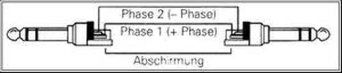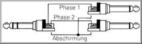 Y-Kabel 6,35mm Stereoklinke auf 2 x Cinch Abschirmung aller Stecker an Gehäuse, Phase1 von Spitze Chinch1 an Ring Stereoklinke, Phase2 von Spitze Cinch2 an Spitze Stereoklinke